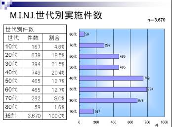 | 要 点 ①3,670例のM.I.N.I.(半構造化面接)にSDS又はHAM-Dを併用して実施した。 ②そのうち、2,992例(81.5%)で大うつ病にチェックがついた。 ③内、750例に躁状態,軽躁状態(25%)にチェックがついた。 ④内、82例にBSDSを実施した。その結果、双極性障害は14%と推測された。 ⑤半構造化面接でチェックがつかず、抗うつ薬で躁転した4例でも実施して,うち3例は双極性障害と推測された。 ⑥こだわっていると自覚していないとチェックしないので、強迫性障害は半構造化面接の数よりも多いことが経過観察で分かっている。 ⑦外傷後ストレス障害はうつ病にカウントされているものが多いと推測される。 ⑧各種不安障害についてMAS,LOI,L-SAS-Jを実施して,かなり正確と推測される。 ⑨精神科診断は基本的に症状診断であり、これに病因検討と併存症の存在を加味した診療が重要であることを示した。 |